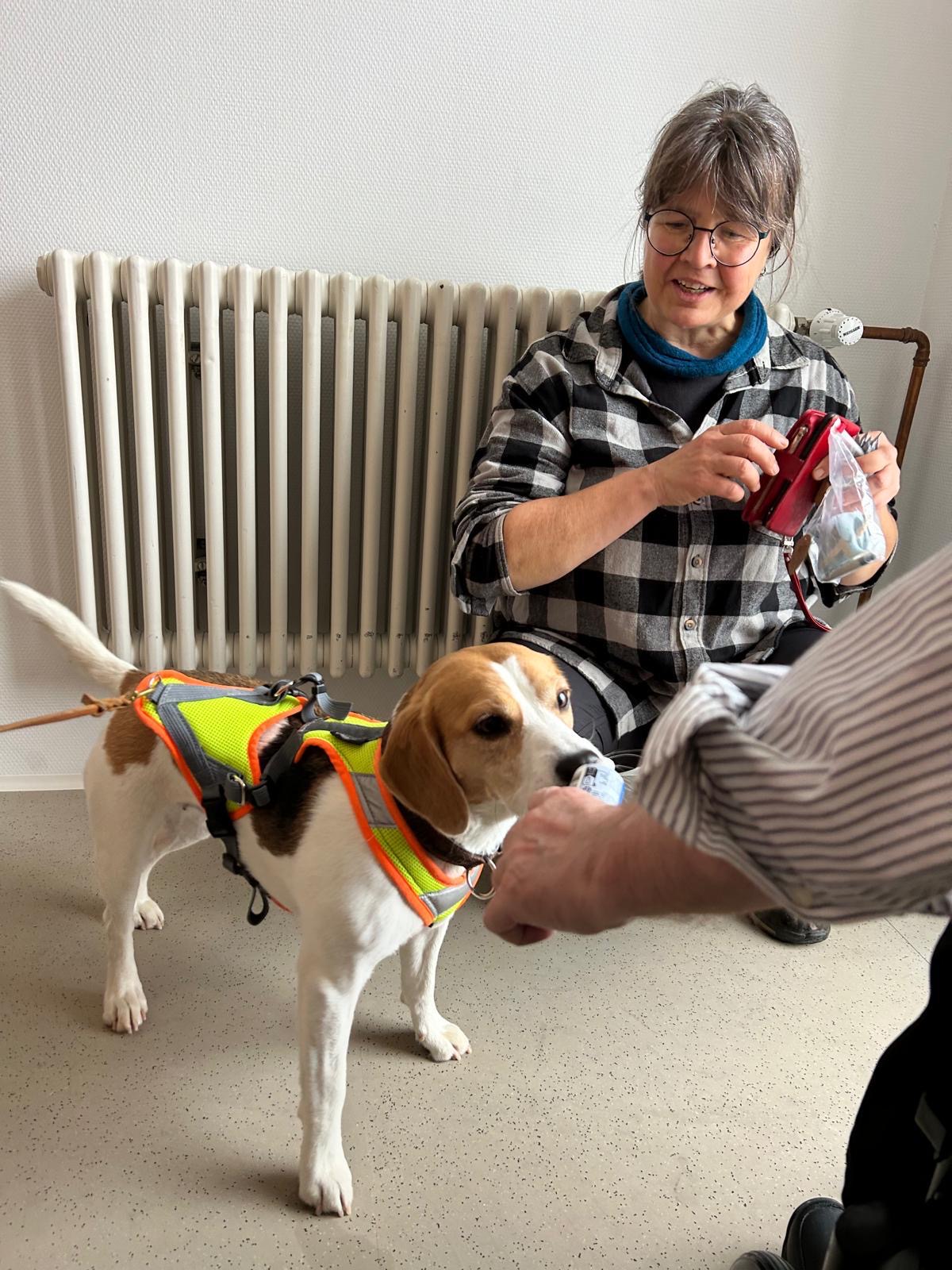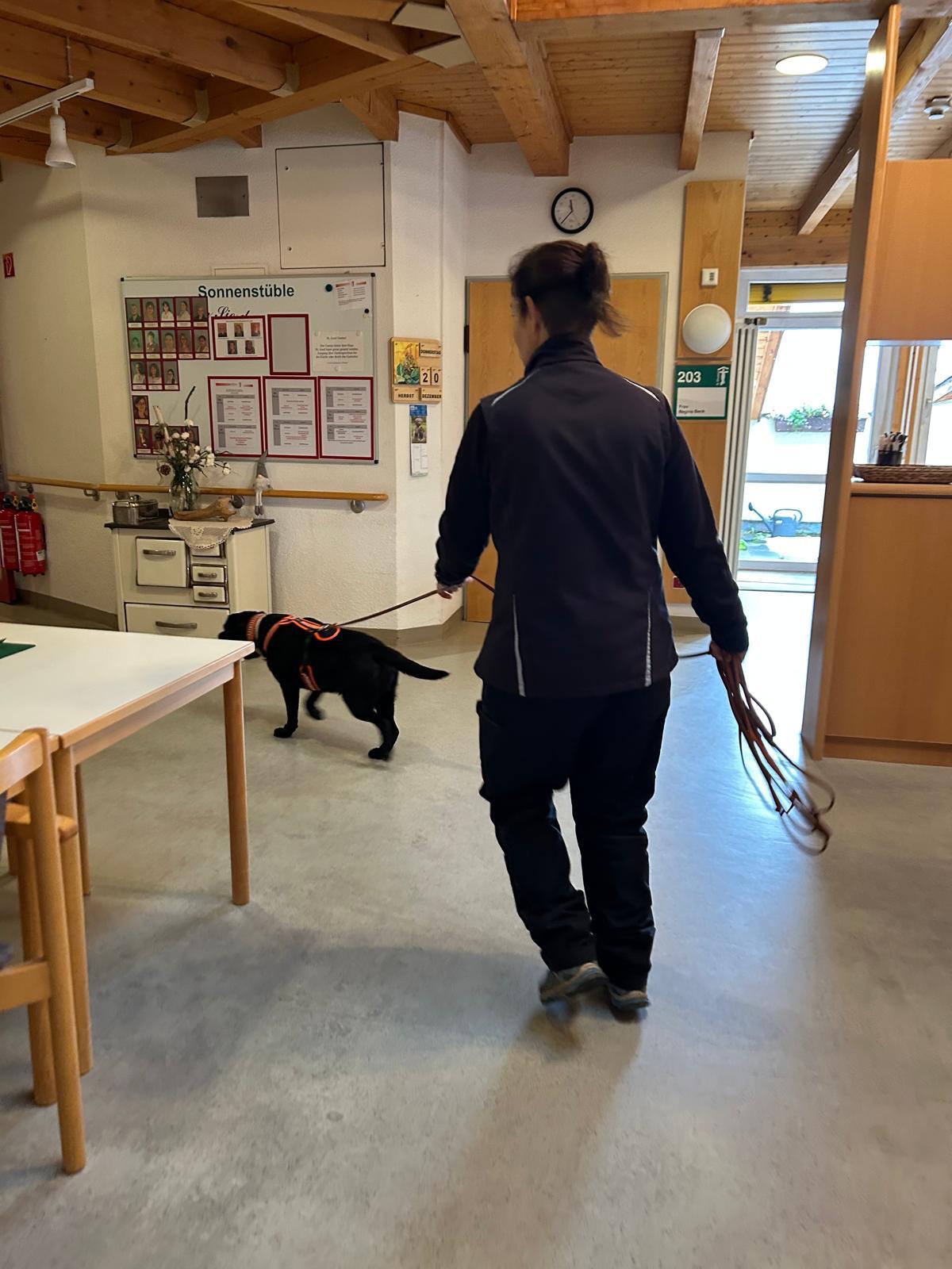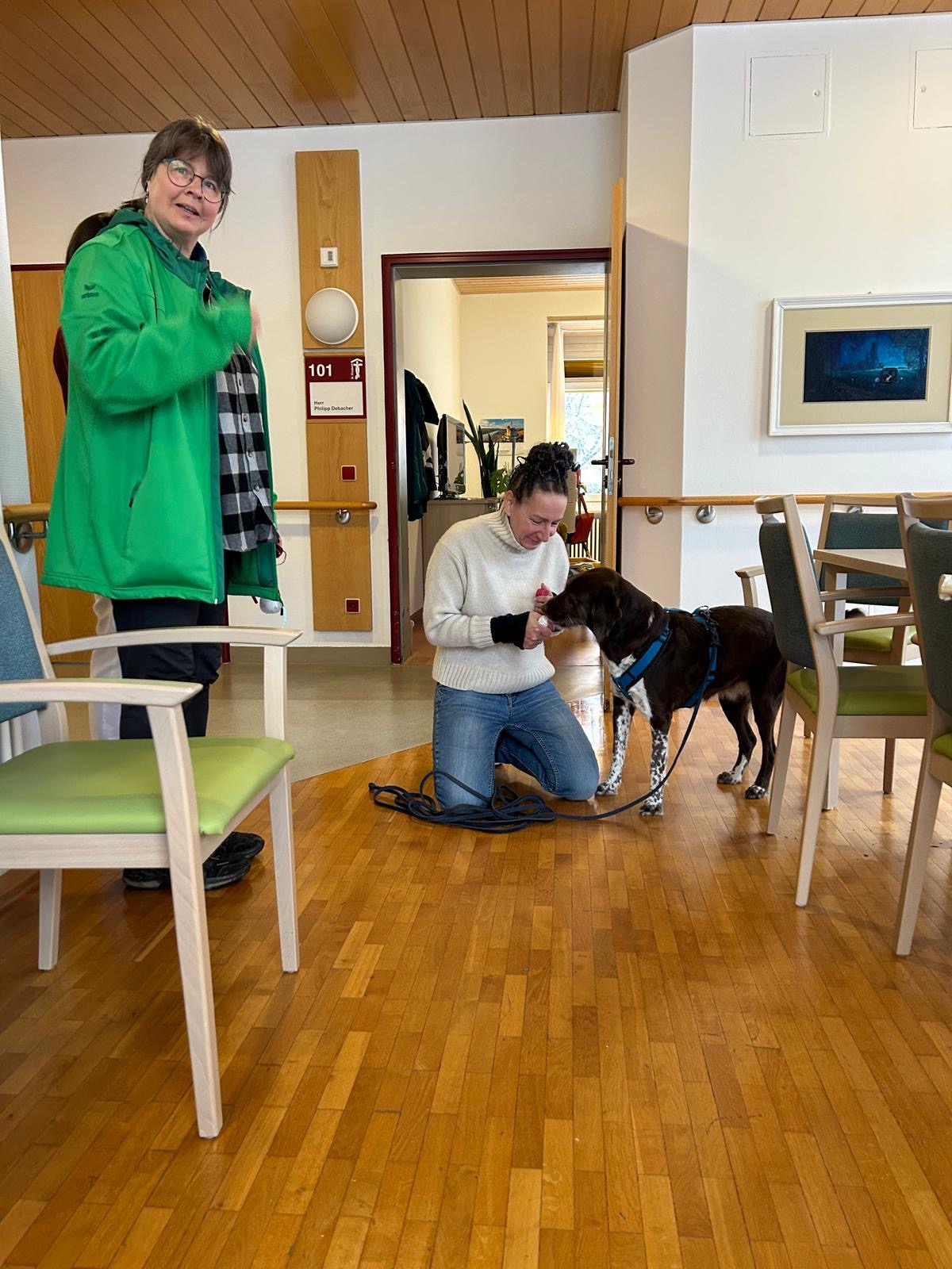 Einige der Bewohner, oft vormals selbst Hundebesitzer, stellen sich als Versteckperson zur Verfügung. Für die Hunde war die Suche gar nicht so einfach: Beim Start am Frühstückstisch mussten sich die Vierbeiner gleich zwischen den restlichen Krümeln am Boden und dem Geruchsartikel entscheiden. Vorbei an Putzmaschinen, Essenswägen, Hoyerliftern, Küchen, Lagerräumen, Rollstühlen, rein in den Aufzug, treppauf und treppab ging die Suche. Strahlende Gesichter der gefundenen Bewohner erwarteten die Teams und der ein oder andere durfte seinen Hund füttern oder streicheln.